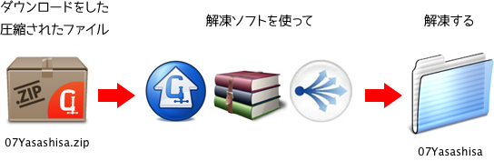 まず+Lhaca、StuffIt Expander、WinRAR、Lhaplus等の解凍ソフトを使用し解凍し