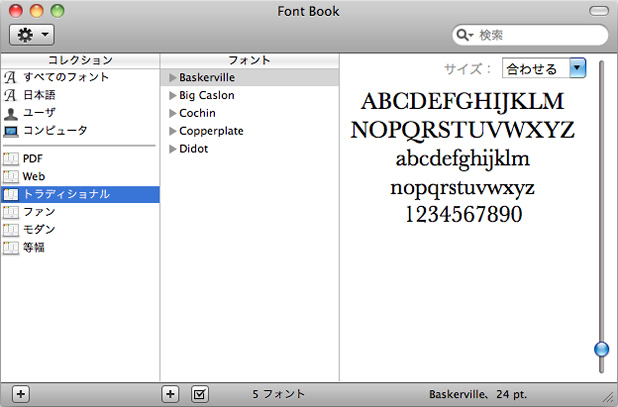 「トラディショナル」をクリックするとBaskervilleなど伝統書体が表示されます。