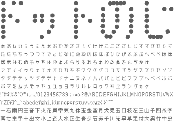 ドットのじは、チープなドットプリンタの文字をもとにつくられたフォントです。ひらがな・カタカナ・英数字・いくつかの記号・小学1年生でならう漢字80文字が入っています。このフォントの魅力は「チープ」なという所だと思います。わざとガタガタになっているところが面白いのです。あとすこし縦長なのが雰囲気だしています。それに加えてアルファベットとの親和性も高いと思います。