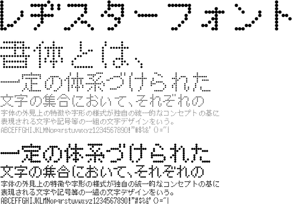 かつてミヤヂマタカフミのレヂスター95フォントが流行ったことがありましたが、あれは整っているデジタルっぽさが面白いフォントでしたが、これはその逆の発想フォントです。ちなみにミヤヂマさんのフォントは進化型のがFONT×FAN STANDARDやFINTWIRE3400に収録されています。(以下画像)